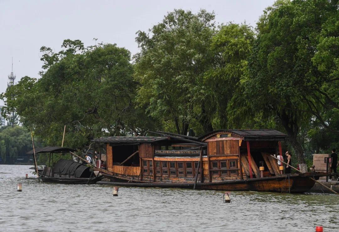 7月1日,嘉兴南湖景区内停泊的中共一大纪念船。新华社记者 徐昱 摄