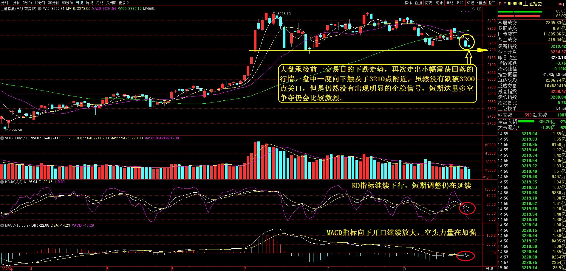 周五大盘继续走出小幅震荡调整的走势,盘中一度下向触及到3210点附近位置,虽然并未跌破整数关口,但是仍未出现有效止跌的信号。早盘大盘小幅高开在3234点,随后走出小幅震荡回落走势,虽然在早盘阶段 出现一波上攻,但是仅反弹至3239点后便再次下行。午后大盘基本上处于横向震荡调整之中,尾盘有所企稳最终报收在3219点,成交量为2206亿元。今日大盘在前一交易日出现明显调整走势的情况下,仍然未能走出企稳反弹的行情,而是对3200点一线的支撑位进行了初步测试,虽然没有跌破这一整数关口,但是短期大幅下跌的动力有所减弱。从盘中热点情况来看,以券商板块、船舶制造、航空航天、以及农业板块旅游板块均出现了一定的反弹 ,但是其对指数的拉动作用明显不足。而下跌的主要是半导体、光刻胶、国产芯片、以及农业板块等,科技股的持续低迷对市场人气的影响还是较大的,当前市场的赚钱效应也大幅降低。对大盘后市运行情况我们认为,目前 在3200点一线将是一个重要的位置,其多空争夺的结果将决定指数中短期的走势方向。因此从操作上来说,在短 期多空未分出胜负之前,还是要保持必要的耐心,等待大盘企稳后的机会,同时要严格控制仓位在三成以内。(仅供参考!深圳明时投资)