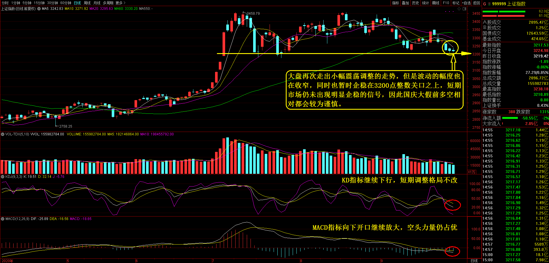 周一大盘再次走出小幅震荡调整的走势,虽然没有出现明显的对3200点一线的杀跌动用,但是向上反 弹的力度也十分弱,短期仍有调整要求。早盘大盘小幅高开在3224点,此后在略有震荡回落后走出一波反弹走势 ,在最高反弹至3238点后大盘走出逐渐回落的调整走势。午后大盘虽有一定反弹,但无奈成交量不配合,最终回 落并报收在3217点,成交量为2096亿元。今日大盘仍然没有出现明显的企稳走势,而是走出了持续小幅震荡调整 的弱势修正行情,暂时守住3200点整数关口,但是由于市场的短期趋势仍处于下跌之中,因此3200点一线的争夺 并未结束。从盘中热点情况来看,市场热点比较少,而且较为分散,其中煤炭、民航机场、酿酒板块以及银行板 块有小幅的反弹,其他大部分板块均处于调整之中,反映出当前市场投资者的情绪普遍较为谨慎,炒作热情也在 不断下降。特别是在国庆大假来临之前,市场主力为规避不确定的因素,也不敢采取比较激进的操作策略,以防 范大假中可能出现的风险。因此,在节前大盘大概率会保持震荡偏弱的走势格局,可操作性也会明显降低。建议 在大假前需要控制好仓位在三成以内,等待节后市场形势的明朗。(仅供参考!深圳明时投资)
