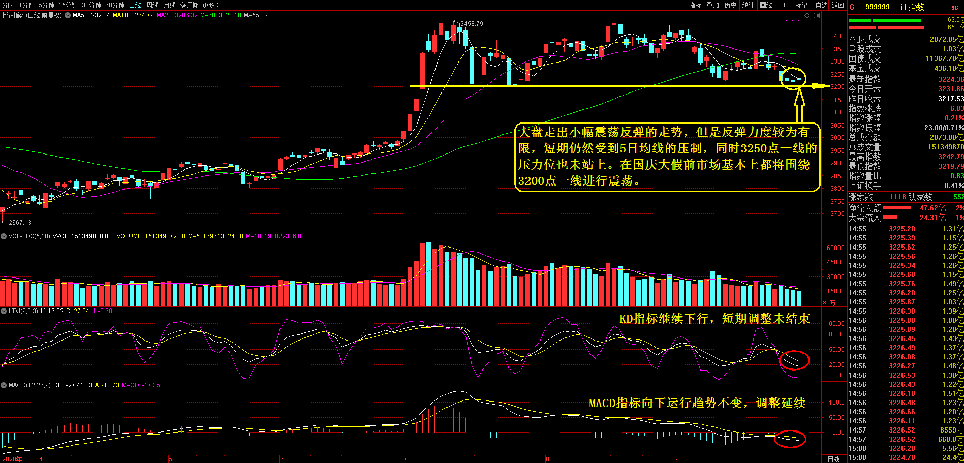 周二大盘止住了下跌的走势,展开小幅震荡反弹的行情,但是反弹的力度实在是太弱,连3250点都未 触及便再次调头回落,继续站在3200点整数关口之上。早盘大盘小幅高开在3231点,在震荡整理后大盘展开明显 反弹走势,在最高反弹至3242点后大盘震荡回落。午后大盘基本上呈现出小幅震荡回落的走势,并一直保持到收 盘,最终以3224点报收,成交量为2073亿元。今日大盘仍然暂时止住了此前的连续调整走势,迎来了一个小幅震 荡的反弹行情,但是可以看到,由于缺乏成交量的配合,反弹的力度非常弱,甚至都未能对3250点一线的压力位 构成任何威胁。从市场热点来看,随着海峡两岸目前的局势进一步紧张,包括军工板块、船舶制造、航天航空、 大飞机,以及无人机等军工概念整体走强,同时光刻胶、芯片概念也有所表现,而权重板块表现则不佳。另外我 们可以发现,近期成交量一再萎缩,目前的成交量已经低于了春节前的水平,反映出当前市场投资者的观望情绪 十分明显。接下来,大盘在国庆大假前应该不会有太大的变化了,在3200点上方的震荡筑底将是大概率事件。操 作上,建议在节前要控制好仓位,可以继续重点关注军工板块中未大幅上涨的品种做一些低吸。(仅供参考!深圳明时投资)