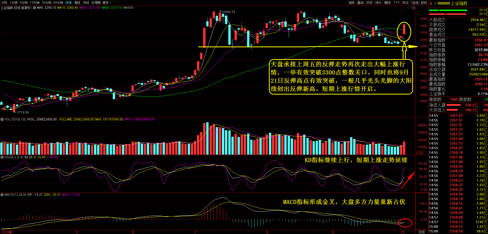 周一大盘终于走出了大幅上涨的行情,一举突破3300点和3350点两个重要关口,并且创出9月份以后大 盘反弹以来的新高,站在了所有短期均线之上。早盘大盘再次高开在3287点,而这也几乎成为了全日的最低点, 此后大盘走出了单边震荡上涨的走势。午后大盘基本上维持了早盘阶段的上攻走势,进入到震荡上攻行情之中, 终盘以3358点报收,成交量为3557亿元。今日大盘承接上周五的反弹走势再次展开强势反弹行情,一举站上3300 点整数关口,同时还有效突破了9月21日形成的短期反弹高点,使得短期大盘的调整走势宣告彻底结束。从市场热 点来看,和上周五的热点比较相近,包括半导体、太阳能仍然保持活跃,同时数字货币、特高压、芯片概念和酿 酒板块也有较好的表现。由于今日大盘又是一个普涨的局面,因此不排除后市板块之间会出现较明显的分化走势 。由于今日大盘收出了一根几乎光头光脚的放量大阳线,因此其在技术上的意义是十分明显的,大盘已经重新进 入到上涨走势之中。操作上,建议可以积极介入近期板块走势中的强势板块,特别是才从底部启动的应该优先考 虑,仓位可以适当放宽至半仓以内。(仅供参考!深圳明时投资)