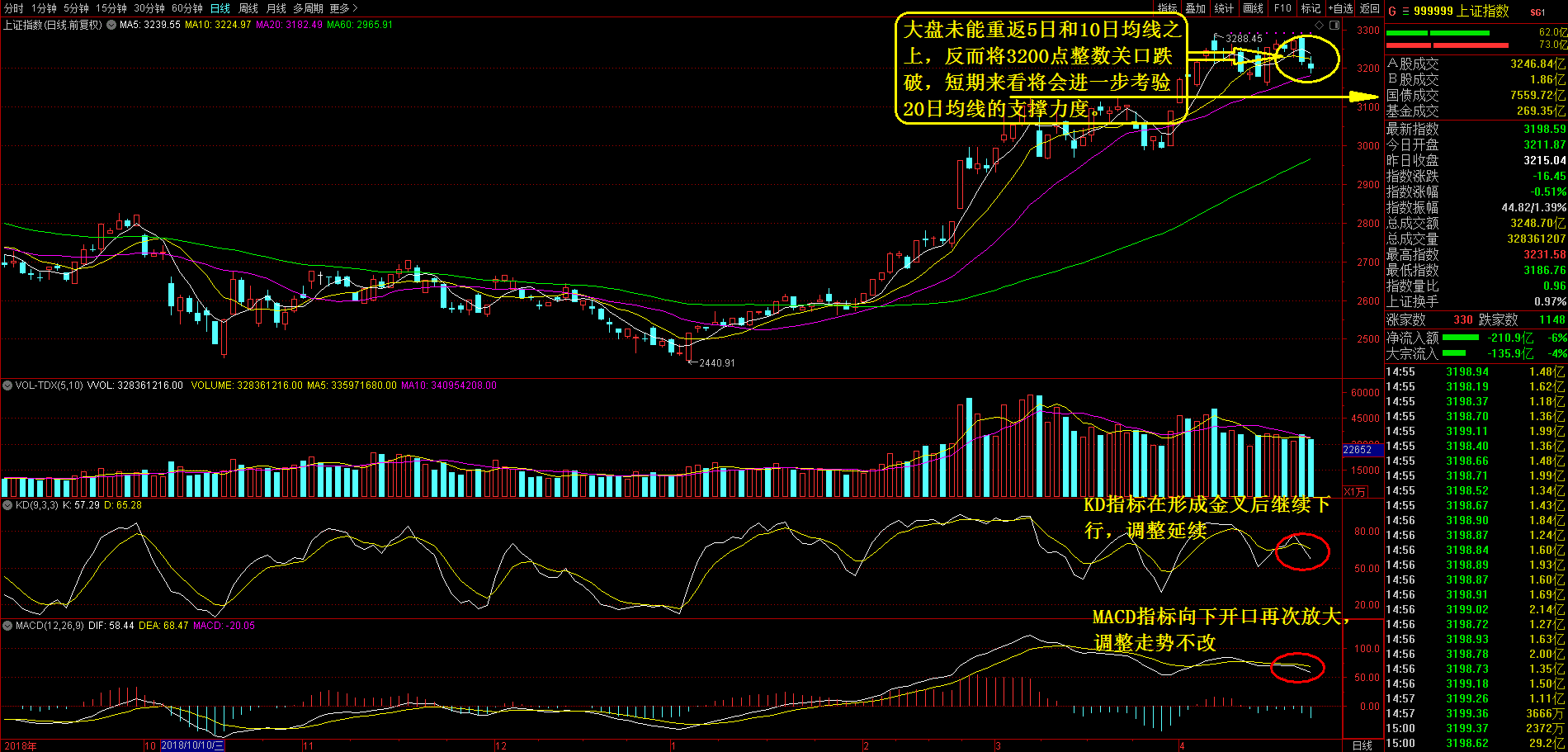 周二大盘继续走出小幅震荡调整的行情,并且在盘中再次跌破3200点整数关口,前期支撑位面临考验。早盘大盘小幅低开在3211点,此后大盘展开小幅震荡调整走势,在最低下跌至3186点后大盘企稳反弹。午后大盘一度反弹至3231点,但是由于买盘不济大盘再次调头下行,最终以3198点报收,成交量为3248亿元。从今日大盘的走势可以看到,市场短期在周一调整的基础上继续走出小幅调整走势,并且在盘中跌破了3200点整数关口,同时在周一失守5日和10日均线后,周二未能将其收复,短期格局已经处于趋弱的态势。应该说不管大盘目前以什么样的方式进行震荡,都无法改变其进行头部构筑的事实,所以对于当前大盘反复的来回拉锯,也不过是这延长顶部构筑的时间罢了。大盘在4月8日创出的阶段性反弹高点也将成为重要的压力关口,对大盘形成明显的压制作用。从盘面上看,市场热点已经明显降温,可操作性不强。接下来应该利用大盘最后的震荡机会,对手中的持股进行逐步离场操作,特别是前期已经大幅走高的品种。(仅供参考!深圳明时投资)