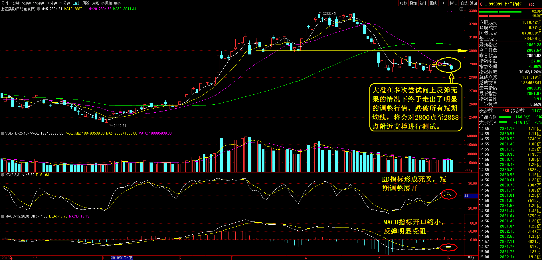 周二大盘终于在连续向上反弹无功而返的情况下出现了较明显的调整走势,将前面的反弹成果一笔勾销。早盘大盘小幅低开在2887点,而这也是全日的最高点,随后大盘展开逐步的震荡下跌走势。午后大盘基本延续震荡的格局,在2点半后大盘加速下探至2851点后有所反弹,终盘报收在2862点,成交量为1811亿元。从今日大盘的明显回落走势可以看到,大盘在经历了一周多的弱势反弹走势后,短期无力进一步向上拓展空间,反而引发了市场的看空情绪不断加大,投资者对后市反弹也逐渐失去了耐心,最终导致大盘重新走弱。虽然大盘的走弱有当前外围市场和国内环境的综合影响,但是这样的结果我之前也是反复给大家进行了提示的,因此对于短期反弹的夭折完全是预料之中的。至于大盘是否会再次向下去测试前期2838点一线的支撑,则要观察当前管理层的态度以及外围市场的状况,所以接下来大盘2800至2838点附近的支撑位面临严峻考验。操作上目前最好的策略仍然是保持空仓观望,在大盘没有企稳前不要试图去抢反弹。(仅供参考!深圳明时投资)
