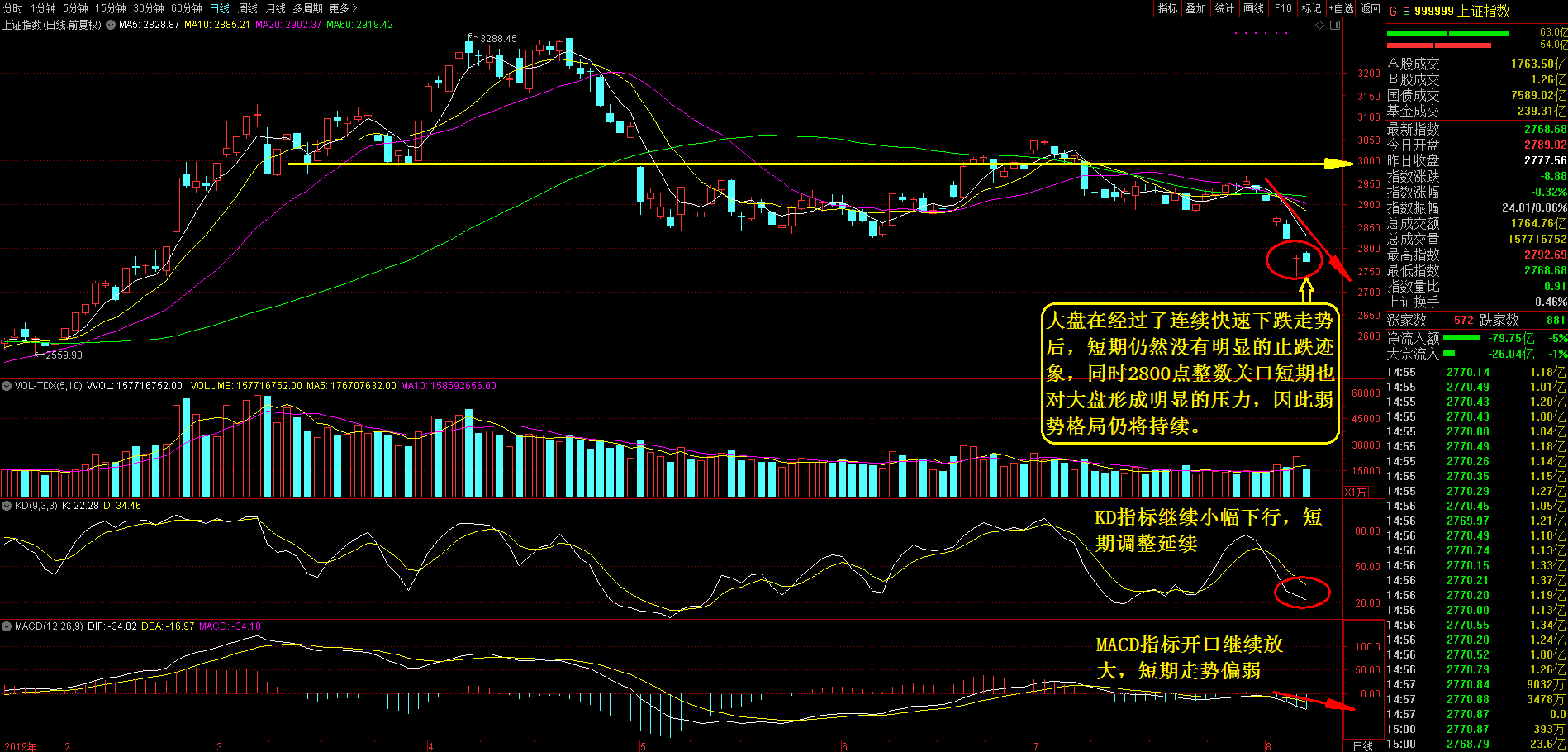 股市收评:周三仍然维持着弱势调整的格局,虽然外盘出现明显反弹,但是大盘仍没有企稳的迹象,继续走出调整走势。早盘大盘直接高开在2789点,而这也几乎是全日的最高价位,此后大盘一路展开震荡下跌走势。午后大盘再次走出了小幅反弹的行情,但是力度明显有限,2点后大盘持续下跌,终盘以2768点报收,成交量为1764亿元。从今日大盘的走势可以看到,虽然短期大盘已经走出了连续的跳空下跌走势,而且已经连续跌破了2900点和2800点两个重要的支撑位,但是空方杀跌力量的宣泄仍然没有完结,可见此波空头真是来者不善。从这波下跌行情可以发现,中小板和创业板的下跌力度并没有权重板块大,这说明此前中小盘股票的下跌幅度已经较大,短期杀跌动力有所不足。而权重板块中的银行和保险板块,由于积累了较大的上涨空间,因此短期存在较大的调整动力,而且他们的联袂下跌对大盘指数的拖累也是较为明显的。对于后市走势能否企稳反弹,要观察权重板块何时能够止跌,操作上,建议继续空仓等待大盘真正企稳后的反弹机会。(仅供参考!深圳明时投资)