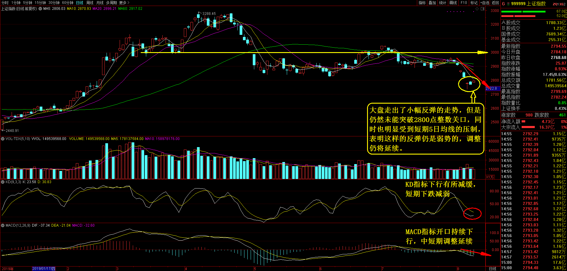 周四大盘终于走出了小幅反弹的走势,但是反弹并没有能够重新回到2800点整数关口之上,仍受到5日均线的压制。早盘大盘小幅跳高开在2784点,此后大盘基本呈现出小幅震荡反弹的走势,波动幅度相对有限。午后大盘延续了震荡反弹的格局,在最高反弹至2799点后有所回落,终盘报收在2794点,成交量为1781亿元。在连续多日的连续快速下跌后,大盘今日终于出现了小幅的反弹行情,但是仔细观察大盘的走势可以发现,这样的反弹走势对当前市场格局并没有太明显的影响。一是自大盘在本周跌破2800点整数关口后,就一直未能重返这个重要心理和技术关口之上,包括今日的反弹大盘也未能突破,可见反弹是典型的弱势修正。二是大盘目前短期均线呈现出明显的空头排列,也就是表明当前市场是典型的空头市场,而今日大盘的反弹也是受制于5日均线的反压。所以,对于当前的弱势反弹,不必抱有太多幻想,还是那句话,当前大盘已经进入到弱势调整之中,在没有真正企稳前,唯一正确的策略便是空仓等待。(仅供参考!深圳明时投资)