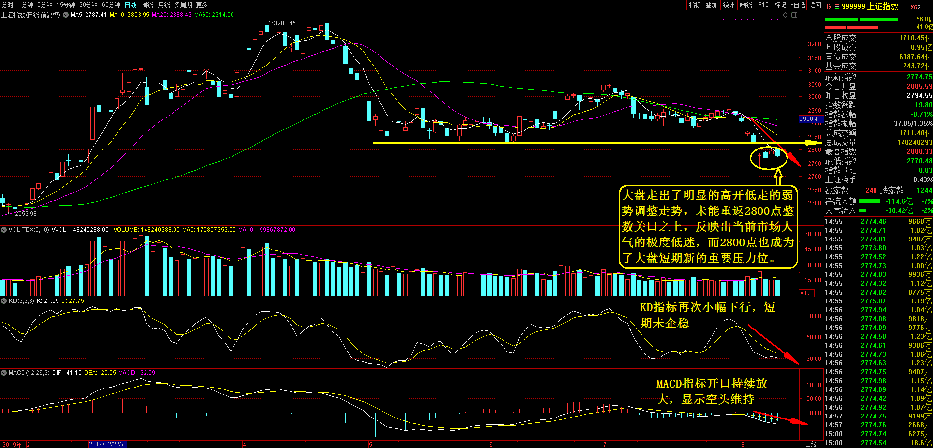 周五大盘虽然试图向2800点上方发起冲击,但是仍然未能成功站上,反而全日走出了高开低走的调整走势。早盘大盘直接跳高开盘在2805点,但是此后大盘并未表现出继续上攻的意愿,反而走出了明显的调整行情回落到2800点之下。午后大盘基本维持逐步震荡走低的调整走势,最终以2774点报收,成交量为1711亿元。大盘今日虽然受外围市场和消息影响出现了一定的高开走势,但是终究未能将其转化为进一步的反弹走势,很快大盘便重新失守2800点整数关口,全日呈现出典型的高开低收行情。从大盘当前的走势来看,仍然是十分明显的弱势调整走势,虽然短期内已经连续下跌超过了200点,但是却无法聚集起较强的反弹动能,这说明目前市场的人气十分低迷,投资者对大盘的上行完全没有信心。由于2800点一线是很重要的压力位,所以,不论是多方还是空方,在这里都会有一番争夺。但就当前情况来看,空方占有明显优势,如果多方没有大的增量资金和利好消息的配合,要想重返2800点之上难度极大。操作上,建议继续保持空仓观望,等待大盘的最终企稳。(仅供参考!深圳明时投资)