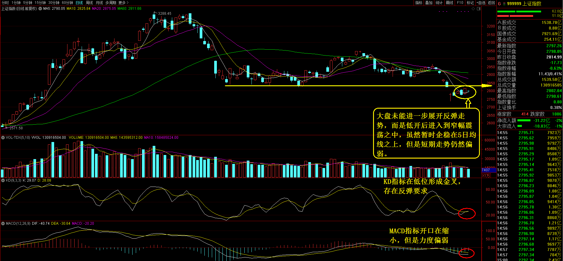 周二大盘未能延续前一交易日的反弹走势继续上攻,反而走出了低开后的小幅震荡调整走势并再次失守2800点整数关口。早盘大盘受外围市场下跌影响直接低开在2798点,此后大盘并没有展开明显的反弹走势,而是走出了小幅横盘震荡的行情。午后大盘基本上维持了震荡格局,终盘以2797点报收,成交量为1539亿元。今日大盘由于受到外盘大幅调整的影响出现了较明显的低开,再次跌破了2800点整数关口,而且由于反弹力度太弱,也未能再次突破2800点整数关口的压制,收出了一颗小阴十字星。对于大盘的这个低开窄幅震荡走势,我们可以看到大盘目前表现出明显疲弱态势,虽然指数最终收在了5日均线之上,但是却未能站上2800点整数关口,同时10日均线仍在快速下行,使得上方的压力进一步下移。结合当前大盘所处的位置来看,8月6日形成的这个向下跳空缺口对大盘有较强的压力,在没有其他利好消息的情况下,大盘很难重返2820点的压力位之上。操作上,大盘已经再次进入弱势运行之中,对盘中反弹一定要保持谨慎,坚持空仓观望。(仅供参考!深圳明时投资)