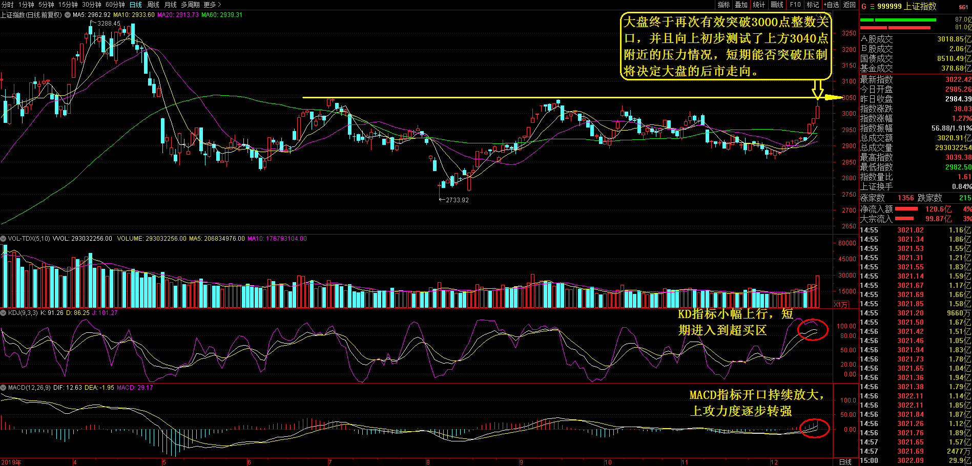 周二大盘终于迎来了放量大涨的强势上攻行情,一举有效突破3000点整数关口,并且一度上冲至3039 点上方,短期强势格局已经显现。早盘大盘小幅高开在2985点,在经过小幅震荡后便走出震荡上攻的走势,并在 11点后快速拉升突破3000点关口。午后大盘继续展开上冲走势,在最高上攻至3039点后有所回落,最终以3022点 报收,成交量放大至3020亿元。今日大盘终于从量变到质变,走出了放量上攻的强势大涨行情,并且再次有效突 破了3000点整数关口,市场投资者人气明显被激活。从上周末在利好消息的刺激下大盘开始出现上攻走势以来, 我们可以发现主力上攻的节奏还是显得比较缓和谨慎的,在连续上攻至2990点一线的关键位后,对市场资金面以 及主力的上攻决心都是一次较大的考验。而今天市场主力终于放手开干,以银行、保险、证券和地产为首的权重 板块集体发力,推动大盘有效攻克了短期重要压力位,并且一口气将3000点整数关口踩在脚下,多方力量得以有 效释放。应该说,大盘运行到当前位置已经基本奠定了短期强势的格局,目前唯一对大盘构成重要影响的只剩下 3040至3050点附近的强压力位,而这里也是今年多次对大盘构成重要压制的位置。所以,在目前保持谨慎乐观的 前提下,需要继续关注这里能否被突破,操作上,建议重点围绕金融类和地产权重板块进行操作,仓位可控制在 半仓以内。(仅供参考!深圳明时投资)