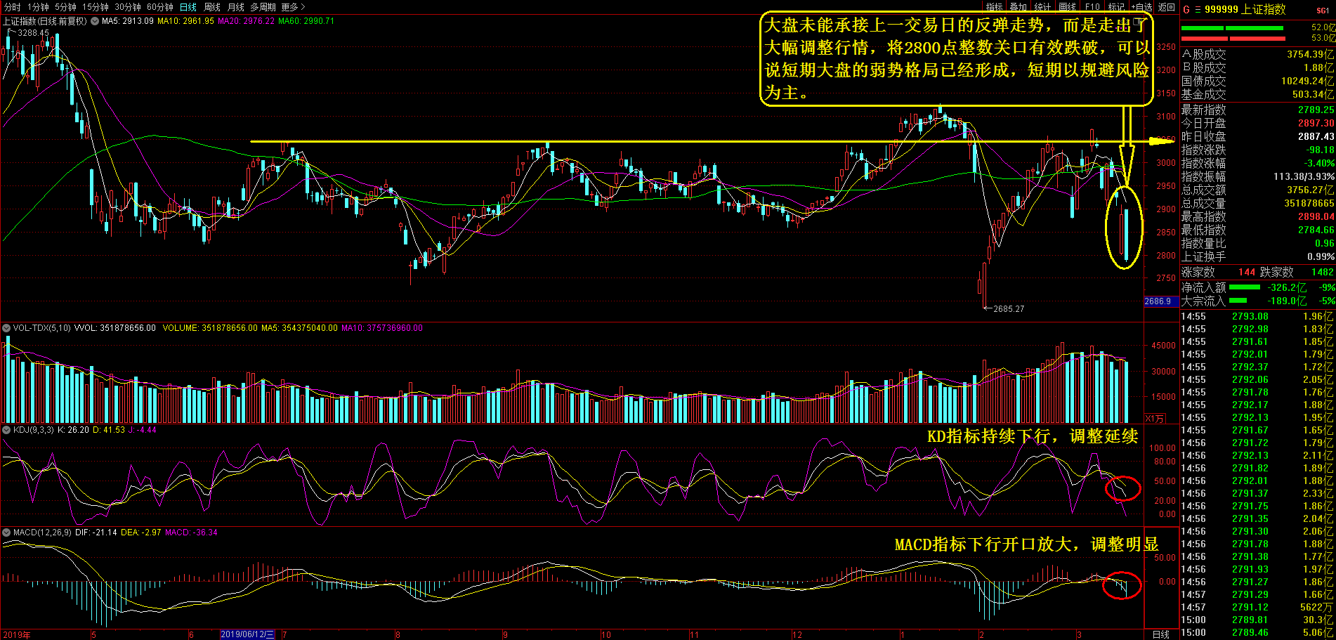 周一大盘在外围市场再次出现恐慌性下跌的情况下,走出了大幅调整行情,不仅将前一交易日的大阳 线吞末,还有效跌破了2800点整数关口。早盘大盘在周末利好消息影响下小幅高开在2897点,此后大盘走出小幅 震荡调整的走势,波动幅度相对有限。午后大盘再次走出持续下杀的强势调整行情,将2800点有效跌破,最终以 2789点报收,成交量为3756亿元。今日大盘在周末央行降准利好消息的刺激下,仅仅只是出现了小幅高开的走势 ,这充分反映出当前市场投资者对于后市的普遍担忧,因此,由于早盘阶段的走势较为疲弱,投资者最终选择出 场而导致大盘崩塌。另外,从盘面热点可以发现,近期相对抗跌的权重板块也加入到了明显的下跌行列之中,这 对市场的打击还是比较大的,特别是银行、保险和券商的集体调整,也加大了大盘的下跌力度。从目前市场走势 来看,在全球疫情快速扩散期,投资者对未来资本市场的发展情况十分担忧,所以,不除外围市场还会剧烈震荡 ,国内股市也较难幸免。操作上,建议保持空仓观望的策略等待市场度过动荡时期。(仅供参考!深圳明时投资)