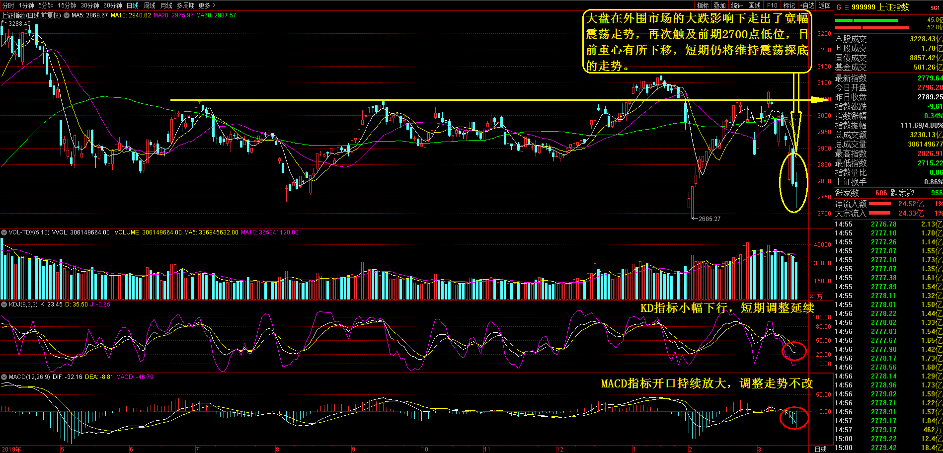 周二大盘虽然仍然受到了外围市场大幅下跌的影响而出现较明显的震荡走势,但是短期的抗跌性却在 逐步显现,继续收盘在2800点下方。早盘大盘小幅高开在2796点,随后大盘在出现快速上冲后便走出回调走势, 大盘走出了明显的回落行情,在最低下探至2715点后大盘逐波反弹回升。午后大盘仅仅略做反弹后便再次展开回 落震荡走势,终盘以2779点报收,成交量为3230亿元。今日大盘在外围市场持续大跌的情况下,暂时止住了大幅 调整的走势,在2700点上方暂时有所企稳,但是从反弹的力度来看,还是有点偏弱,但是在全球市场处于崩溃时 期,国内A股市场能有现在的表现也实属不易。对于目前的行情发展,可以看到,以5G和芯片为主的科技股的反弹 走势普遍偏强一点,而权重板块的暂时企稳对稳定大盘也起到了一定的作用。当前市场已经再次触及了春节后的 调整低位,虽然出现了初步的止跌走势,然而后期大盘能否进一步这此位置企稳,则还需要观察。操作上,现在 市场热点的持续性较差,建议可以继续空仓观望,等待市场的逐步企稳。(仅供参考!深圳明时投资)