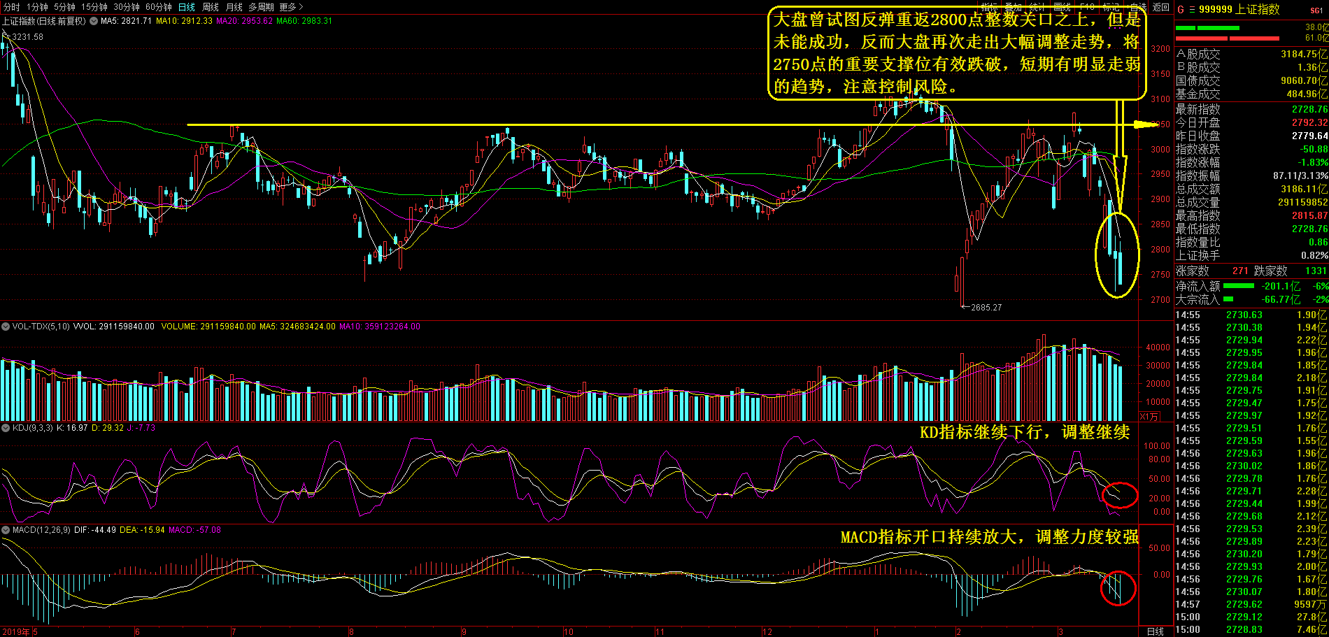 周三大盘在外盘再次熔断的情况下,终于未能抵抗住投资者恐慌的抛盘,最终走出明显的调整走势, 有效跌破2750点的重要支撑位。早盘大盘小幅高开在2792点,此后大盘走出了震荡向上反弹的走势,最高反弹至 2815点。午后大盘急转直下,走出了持续下跌的调整走势,不仅重新跌破2800点,而后一路下行几乎没有遇到明 显的抵抗,终盘以全日最低的2728点报收,成交量为3186亿元。今日大盘的再次大幅下跌对国内A股投资者来说, 是十分难熬的一天,因为此前有众多的媒体和专家预期在外围市场出现持续大幅调整时,资本市场的避险资金会 选择国内A股市场的价值洼地来进行投资,所以投资者产生了较高的预期。但是本周以来的这三个交易日大盘的连 续调整已经将国内A股市场重新带入了弱势之中,而且这种趋势还有进一步转弱的迹象,应该说大部分投资者已经 由之前的盈利变成了亏损。如果大家不加快转变,那么后期市场的变化会让你更加难以接受。在大盘进一步走弱 的情况下,建议投资者需要果断清仓出局,不要错过最后的离场机会。(仅供参考!深圳明时投资)