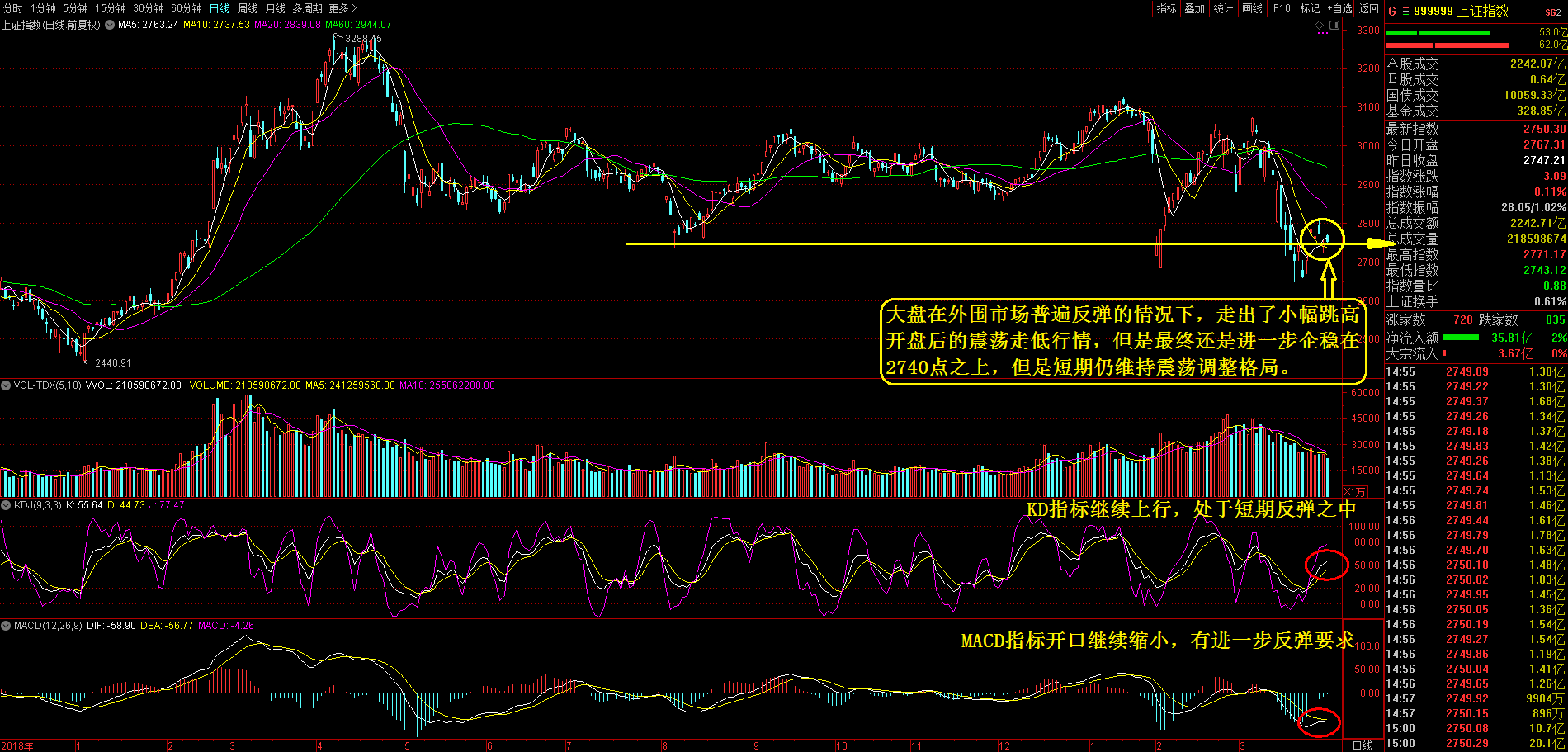 周二大盘在外围市场普遍反弹的情况下也走出小幅反弹走势,虽然整体反弹的力度较为有限,但是仍 然继续小幅企稳在2740点之上。早盘大盘小幅跳高开在2767点,此后大盘走出震荡回落的走势,10点40后大盘走 出逐步反弹行情,在最高反弹至2771点后大盘调头下行。午后大盘呈现出明显的窄幅震荡回落的走势,最终是以 2750点报收,成交量为2242亿元。今日是大盘本月的最后一个交易日,但还是走得十分疲弱,全日大盘的走势是 较典型的震荡调整行情,唯一的看点就是月线收在了2740点的关键支撑位之上。从目前的市场投资者情绪来看还 是比较低迷的,成交量还在进一步的萎缩,这说明市场各方的参与热情在降温,而且也没有明显的增量资金的进 入,所以整体市场走势偏弱。从热点来看,主要还是围绕农业板块来展开,但是市场的参与力度还不是很充分, 这也反映出当前资金面有些捉襟见肘。从大盘目前的走势来看,短期2800点一线的压力还是比较大的,因此反弹 的高度较为有限,所以从操作上来说,还是以防范风险为主,对于上涨走势已经破坏的品种,建议及时止损离场 ,并继续保持观望的态度应对当前市场行情。(仅供参考!深圳明时投资)