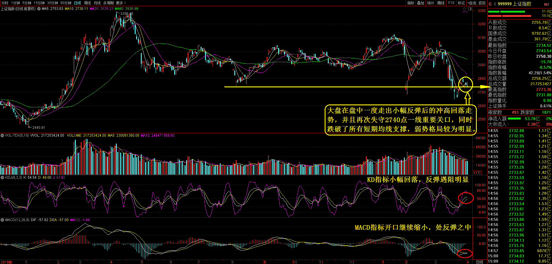 周三大盘虽然盘中出现了一定的反弹走势,但是在2780点一线仍然受到了明显的阻力而出现回落,最 终再次失守2740点重要支撑位。早盘大盘受外围市场调整影响直接小幅低开在2743点,随后大盘走出了逐波震荡 反弹的走势,在最高反弹至2773点后大盘开始出现回落。午后大盘一路震荡下跌,几乎没有遇到明显抵抗,最终 以全日次低的2734点报收,成交量为2256亿元。今日是大盘呈现出较明显的冲高回落走势,这种走势本身也反映 出当前市场投资者的情绪开始变得比较担忧,所以在盘中稍有一定反弹的时候大盘就遇到了较强的抛压,这也是 部分大资金不断离场的表现。从盘面情况来看,权重板块略有所反弹,这样也使得大盘的下跌幅度并不太大,然 而个股的下跌力度却是较大的,特别是近期反弹力度较强的品种都出现了跌停走势,对短线人气的打击比较大。由于全球新冠疫情仍然处于一个爆发期,在没有得到明显抑制的情况下,外围市场的弱势格局就还将持续,对国 内A股市场的影响也就还会延续。所以,从操作上来说,在当前市场环境下,只有严格做到空仓才能有效规避市场 风险,等待疫情影响逐步减轻后市场的企稳回升。(仅供参考!深圳明时投资)