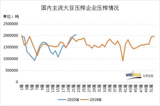 国内主流大豆压榨企业2020年第22周压榨量为2032100吨,较之前一周增加39900吨,连续第四周攀升,明显高于去年同期。市场普遍预计5-8月的月均大豆到港量接近1000万吨,随着到港预期逐渐兑现,将给油厂足够的开机动力,大豆压榨量或继续放大。