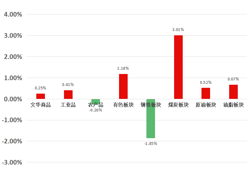 文华商品上涨0.25%,工业品上涨0.41%,农产品下跌0.26%,有色板块上涨1.18%,钢铁板块下跌1.85%,煤炭板块上涨3.01%,原油板块上涨0.52%,油脂板块上涨0.67%。